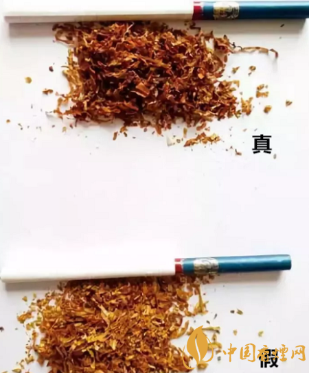 真品卷烟的烟丝由叶丝组成,烟丝切丝均匀,光泽油润性好,碎末少,颜色为柠檬黄;假冒卷烟的烟丝由碎梗、碎丝组成,工艺粗糙,烟丝宽度不均匀、多为碎末,经硫磺熏制后呈黄白色。