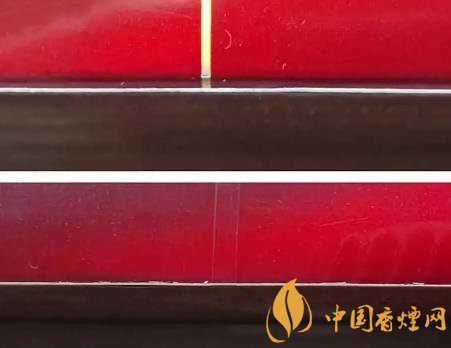 真品卷烟商标纸边缘裁切干净、光清,无毛边。该款假冒卷烟商标纸边缘裁切粗糙,毛边多。(上真下假)