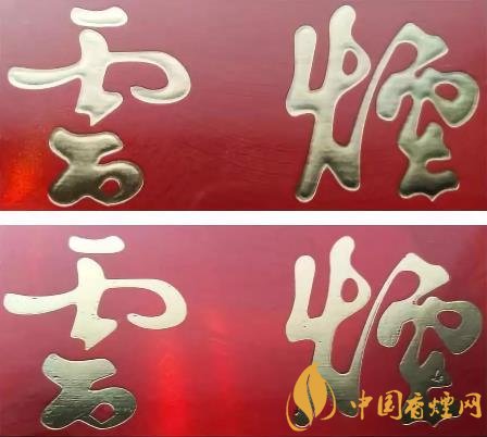 真品卷烟云烟字体烫金印刷明亮、清晰、完美。字体笔画中间凸起,边缘凹陷,字体饱满,整体立体感强。侧光观察商标纸表面呈现磨砂状,红色线条凸起。该款假冒卷烟云烟字体烫金印刷颜色暗,笔画烫金掉金。字体笔画整体平,无立体感,印刷较为粗糙。侧光观察商标纸表面无磨砂状,红色线条平。(上真下假)