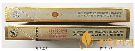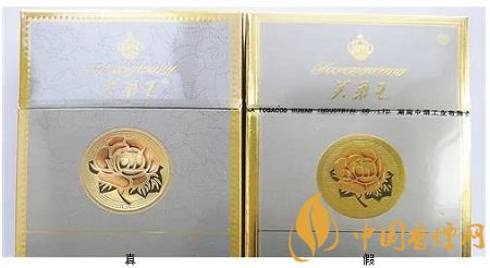 假冒卷烟“芙蓉花”图案立体感不强,金色长方形外边框上无细小压痕。