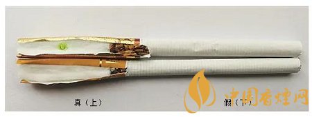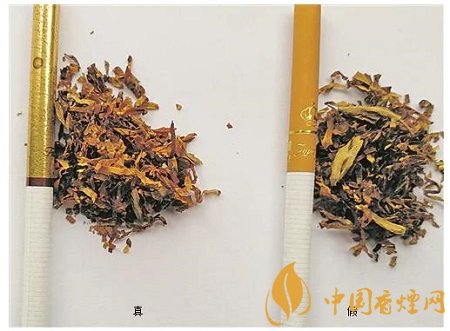 真品卷烟烟丝切丝宽度均匀,烟丝疏松、光泽油润性好、呈柠檬黄色,烟丝结构为纯叶丝。