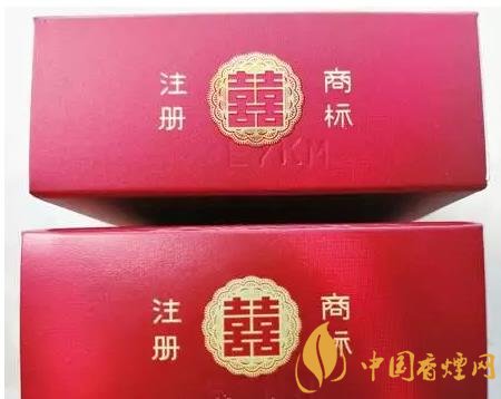 如图所示:真烟背面 “双喜花球”采用激光镭射的防伪技术,立体感强、层次分明、图案清晰,且“囍”字在花球中间位置。假烟背面的“双喜花球”明显无立体感、层次不清、图案较模糊,且“囍”字明显偏离中间位置,与真品特征存在明显差异。(左真右假)