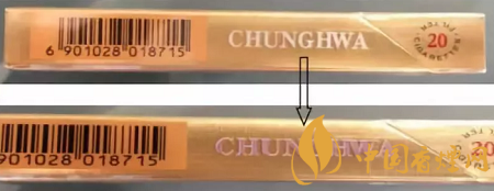 “中华”(双中支)产品小盒采用硬盒(双包)翻盖的包装形式,烟支规格为89mm(长)*20mm(圆周)。小盒侧面英文字母“CHUNGHWA”采用荧光变色防伪油墨;在紫外光照下,白色“CHUNGHWA”会变成紫红色,一段时间后紫红色褪去。