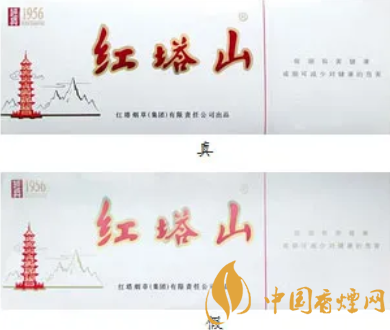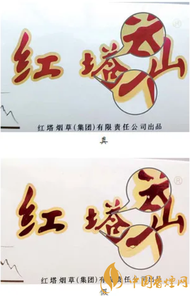 真烟条盒上“红塔山”三个字的颜色为暗红色;假烟条盒上“红塔山”三个字的颜色为鲜红色。