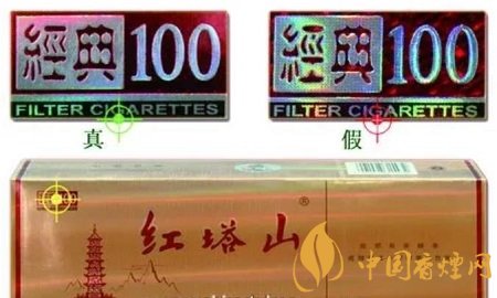 “红塔山(硬经典100)”是红塔烟草(集团)有限责任公司出品的全国知名卷烟,深受广大消费者的喜爱。为提高消费者和零售商户对假冒卷烟的甄别能力,现将查缴的假冒“红塔山(硬经典100)”部分特征与真品卷烟相比较,对照图片如下:
