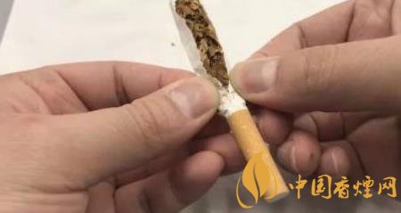 第二,拿出一根香烟,撕开取出里面的烟丝,只需要用到烟丝的这一部分;