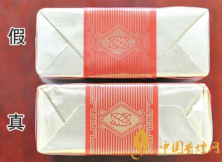 假烟封签竖线条印刷粗细不同,两片烟叶旁边的小圆点有的排列无规则、大小不均匀,内衬纸颜色较浅,凹点密集。