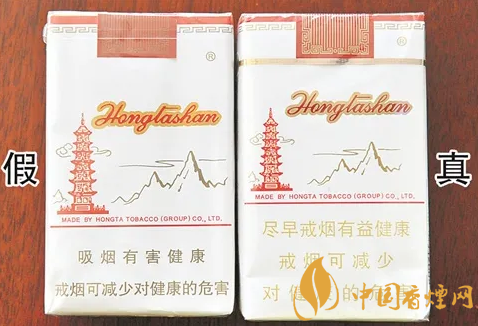 假烟采用胶印印刷,两种颜色交界边缘无锯齿痕迹,“1956”字体笔画粗细不均匀、无立体感且相对较细,红塔图案模糊。