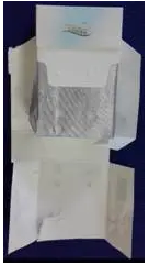 小盒透明纸材质、包装方式同条盒,拉带头为半椭圆形,位于正面左侧,顺时针拉开。商标纸为白卡纸,胶粘剂类型为白乳胶,两侧点阵胶。