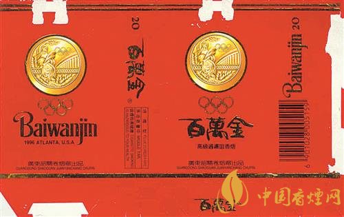 1996年,第26届夏季奥运会在美国亚特兰大举行。上世纪90年代,广东韶关卷烟厂出品了“百万金”烟标(图②)。该烟标以红色为底色,主、副版上均印有金灿灿的奥运金牌以及奥运五环图案,副版上还印有“1996 ATLANTA USA”字样。