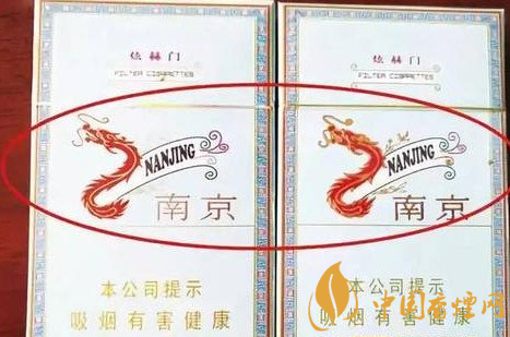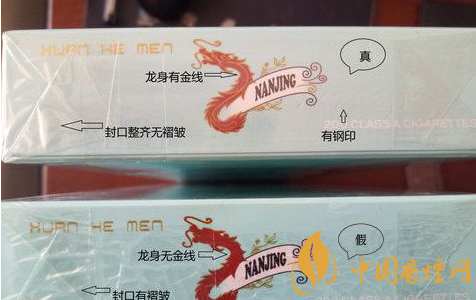南京煊赫门的正品商标与假货是有明显区别的,真煊赫门商标的“红龙”区域经过亚光处理,所以看起来是暗红色,而假的煊赫门商标是用的亮光处理,看起来是亮红色的。除此之外,真品的红龙印刷的非常精细准确,仿冒品的红龙经常没有印全。