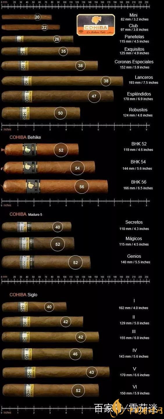 哈伯纳斯旗下的 27 个古巴品牌雪茄,长度基本在 100mm-230mm 之间,环径基本在 10.4-22.8 mm之间。