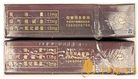 真烟商标纸采用复合镭射银卡纸,胶印和丝网印刷,“和天下”字体采用压凸烫金工艺,用手摸凹凸感较明显,且字体笔画较粗,商标纸上字体、拼音、花纹看上去有较清晰的竖线;假烟一般为高清扫描仿制印刷,“和天下”字体用手摸凹凸感不明显,且字体笔画较细,商标纸上拼音、花纹等处竖线较模糊。