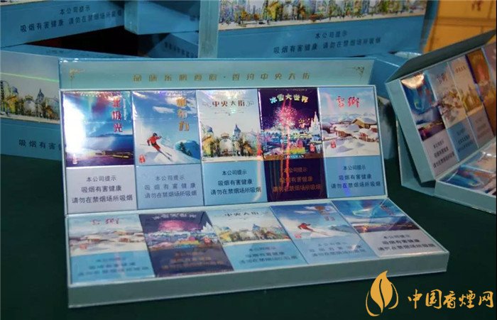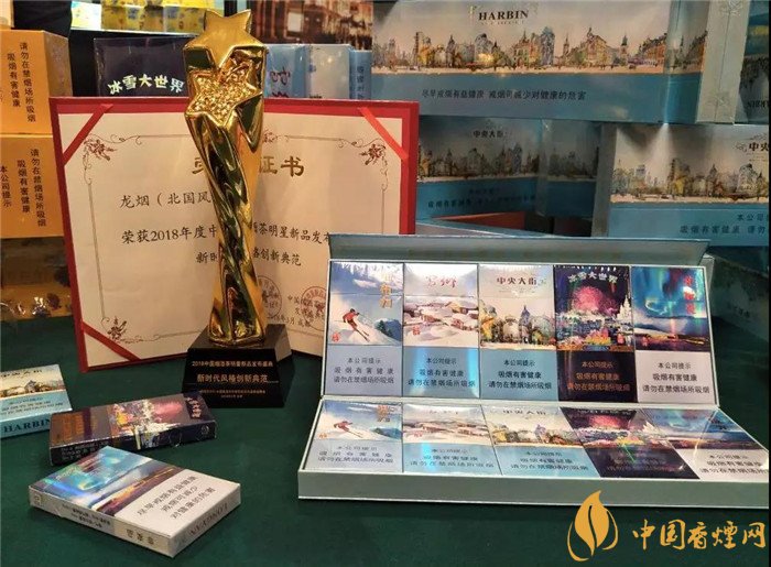 2018中国烟酒茶明星新品 龙烟(红松香)与龙烟(北国风光)系列黑龙江烟草工业有限责任公司的5款龙烟(北国风光)系列新品,分别是“中央大街”、“冰雪大世界”、“亚布力”、“北极光”、“雪乡”。