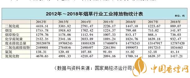 2018年与2012年相比,二氧化硫排放量由4418吨下降到889吨,降幅79.9%;化学需氧量由2532吨下降到932吨,降幅63.2%;氨氮由138吨下降到45吨,降幅67.3%;氮氧化物由4670吨下降到1417吨,降幅69.7%;烟尘排放量由1755吨下降到542吨,降幅69.1%;二氧化碳由259万吨下降到183万吨,降幅29%;废水排放总量由2033万吨下降到1279万吨,降幅37.1%。2017年与2012年相比,有79家卷烟工厂淘汰了燃煤锅炉,使用了清洁能源锅炉。