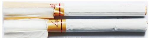 11、烟支过滤嘴长度差异对比:真烟烟支过滤嘴长度为30mm;假烟烟支过滤嘴长度为25mm,与真品特征存在明显差异。