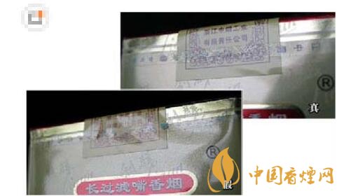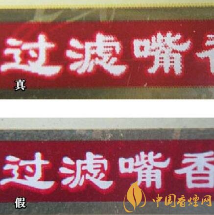 8、真品卷烟的商标采用的是凹印,文字边缘有锯齿状;假冒卷烟的商标一般采用胶印,文字边缘无锯齿状。
