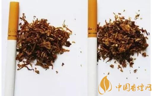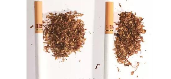 真烟烟丝切丝宽度与长度适中均匀,顔色呈橘黄色,光泽油润性好,柔软疏松,烟丝中含碎末少,烟丝结构为叶丝、膨胀梗丝和造纸法再造烟叶;假烟制丝工艺粗糙,一般使用未经处理的劣质烟丝,色泽发暗无光泽,呈暗褐色,烟丝中含碎末较多,烟丝结构一般为叶丝和没有经过膨胀处理的梗丝,无造纸法再造烟叶,烟丝结构与真品特征存在明显差异。