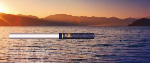 取出一支烟来仔细观赏,却不似包装那般低调。湛蓝色的烟嘴搭配鎏金波水浪纹,看起来华贵又不失稳健,原来在低调的包装之下还有这般威严所在。这种创意灵感来自云南的著名景观抚仙湖。每到夕阳西下,金黄色的阳光洒满湛蓝色的湖面,波光粼粼之下鱼龙跳跃,无限风光尽在此湖。