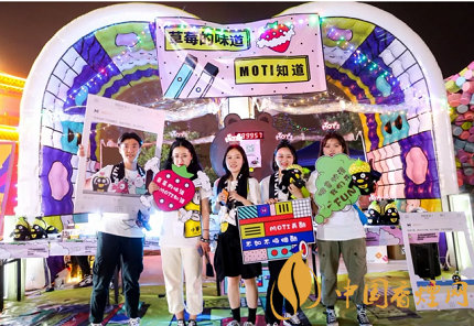魔笛MOTI草莓味道体验馆,作为音乐现场专供粉丝休憩的小吧,距离主舞台直线距离不到10米,由MOTI设计师精心设计的M门洞搭建馆,与现场缤纷潮酷的音乐氛围完美融合。蓝光闪烁的展架上,7款不同颜色的MOTI和5种不同口味的MOJO缤纷陈列,吸引无数现场乐迷前来体验。现场还有超Nice的MOTI小哥哥小姐姐给你专业的推荐。