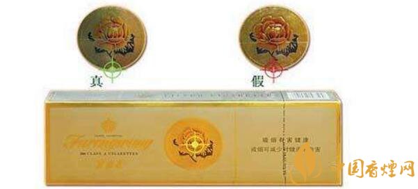 (2)看防伪标记:条盒的正面芙蓉花防伪标记,真烟的印刷在同一侧面看到的只有一个图样;假烟的印刷在同一侧面看到是几个在一起的图样。